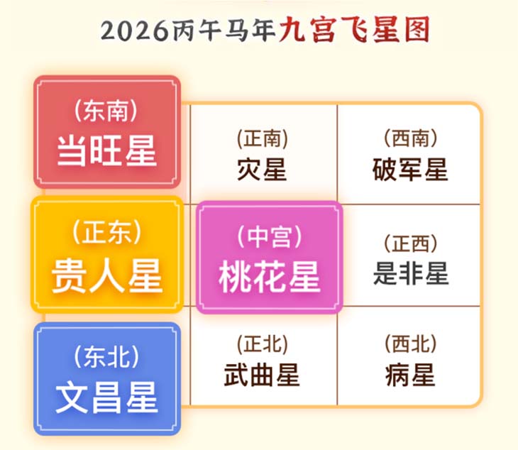 2026年是丙午马年,五行纳音“佛灯火”,太岁名“文哲大将军”。流年太岁方位在正南方位,岁破方在正北方位。自农历2026年是从立春节气,即公历2026年2月4日04时01分开始起至公历时间是:2027年2月4日09时46分止。在蛇年里,随着九宫飞星的位置变动,不同方位的吉凶情况也会发生极大的变化,尤其需要注意流年的五黄、二黑、三煞位等大凶的位置,如大门在这些方位,势必影响阖家的健康和运势,给家宅带来极大的冲击,因此我们有必要详细了解家中九大方位的吉凶情况并做好布置工作。